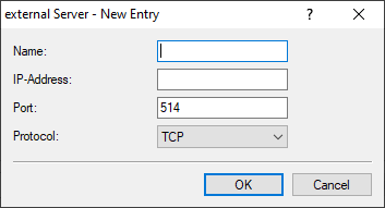 Configure one or more syslog servers in the External Server table. Messages can be sent via TCP or UDP.