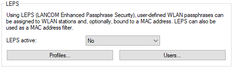 The configuration of the Profiles and Users for LANCOM Enhanced Passphrase Security (LEPS) are located in LANconfig under . The switch LEPS active enables the LEPS feature.
