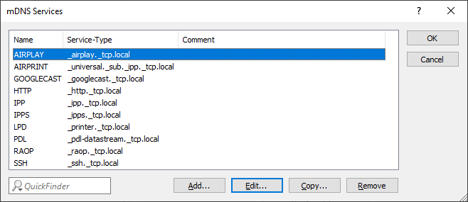 mDNS Services contains the most common mDNS-based services by default, but it can also be manually extended.