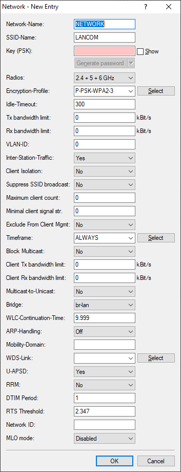 Note: This entry only applies if an encryption profile using WPA(2)-PSK or WEP is selected (please note, that WEP is insecure and is only supported to ensure downward compatibility. However, LANCOM Systems GmbH explicitly recommends using WPA2 or WPA3). If 802.1X is used, the entry has no effect and the field can be left blank.Note: The following restrictions must be considered when using the encryption method WEP: