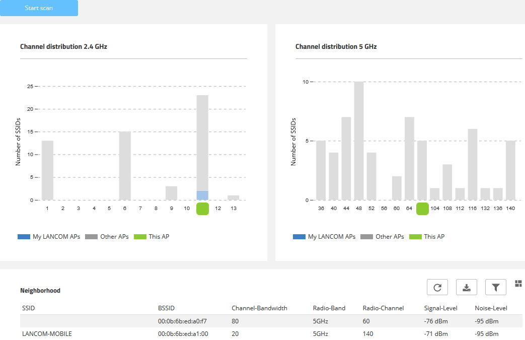 The top two bar charts visualize the number of SSIDs detected by the device on the various 2.4 GHz and 5 GHz channels, which can indicate the potential load on the channels. LANCOM access points detected by the scan and reachable on the same LAN as the current device are highlighted as "My LANCOM APs". The WLAN channel that the current device itself is working on is also indicated. The Neighborhood table also provides details about the SSIDs detected by the scan, such as the name, the BSSID (MAC address), and the signal strength.