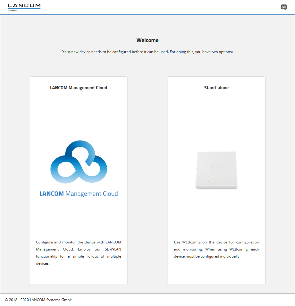 After invoking the WEBconfig interface of an unconfigured device, you can select whether the device should be managed by the LANCOM Management Cloud or as a stand-alone device.