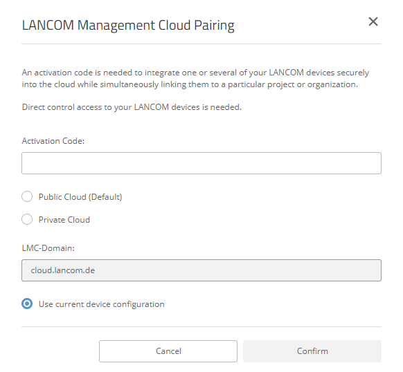 - Shows either the LMC domain of the Public Cloud or you enter the LMC domain of your private instance of the LANCOM Management Cloud.