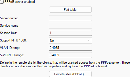The PPPoE server supports Q-in-Q VLANs, i.e. double-tagged VLANs. For incoming PPPoE packets,