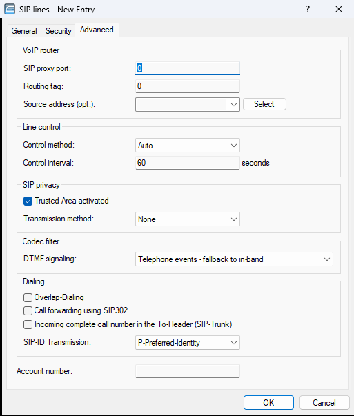 - Enter here a phone number that belongs to this SIP connection. For SIP lines of the type "Flex", this source number is transmitted in the PPI for account verification. If the FROM number is modified by call routing or if the SIP phone sends a number that does not match the connection, this will not cause the call to be rejected by the provider. This allows CLIP no screening calls to be made directly via the VCM, provided the feature is supported by the SIP provider.