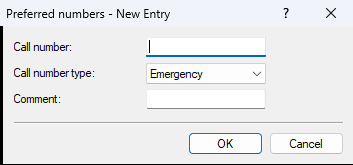 Enter emergency phone numbers in this table. If a call to an emergency number cannot be established due to an error message from the SIP provider, an existing call that is using this line (line type Trunk/Flex) or the associated line group (line type Single Account/Provider) will be terminated. This ensures that a voice channel is available for the emergency call.