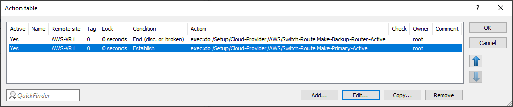 There are two profiles in the HA redundancy table that are referenced in the action table in the Switch-Route command. The first entry causes the backup vRouter to make itself the active router in the AWS routing table if the VPN tunnel (remote site AWS-VR1) to the primary router is disconnected or broken. If the VPN tunnel is reestablished, i. e. the primary router is available again, the primary router is reset as the next hop in the routing table.
