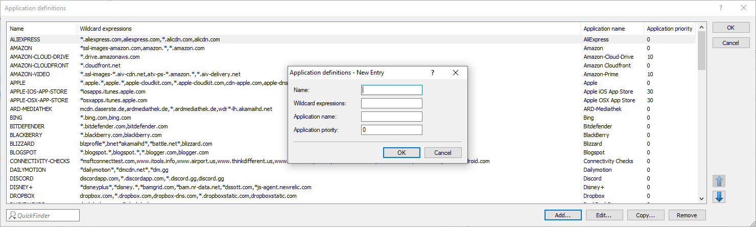 The application definitions for layer-7 detection and layer-7 application control are located in a central table for DNS-based applications (layer-7 app) in LANconfig under (CLI: ).