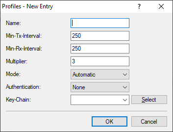 - Name of the key chain from the table Key-Chains. Defines the key used for the BFD messages. For the parameter Authentication, a value must be configured that is other than "None".