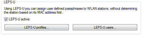 The LEPS-U profiles and LEPS-U users are configured in LANconfig under Wireless LAN > Stations/LEPS > LEPS-U. The switch LEPS-U active enables the LEPS-U feature.