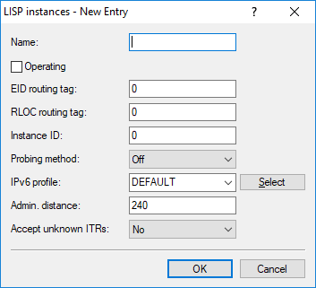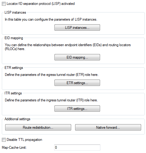 LISP routing is configured in LANconfig under Routing protocols > LISP. The switch Locator/ID separation protocol (LISP) activated is used to switch this routing protocol on or off.