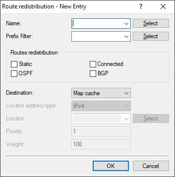 • Map cache: Imports the routes into the map cache. LISP performs map requests for these routes.