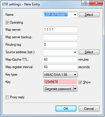 In this tutorial we will configure a LISP network on the basis of an ARF network that is named INTRANET and uses tag 1. This involves registering the network prefix as an EID prefix with the MAP server 1.1.1.1. Registration is performed via the WAN remote site INTERNET (default route), which uses tag 0. The IP address of the INTERNET remote site can be dynamic or static. This address is registered as an RLOC address with the MAP server.