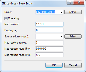 Data from the INTRANET should be sent to the LISP tunnel. For this purpose, the router requesting an unknown destination sends a map request to the MAP resolver 1.1.1.1.