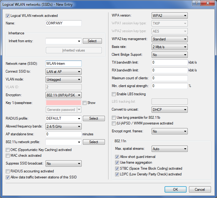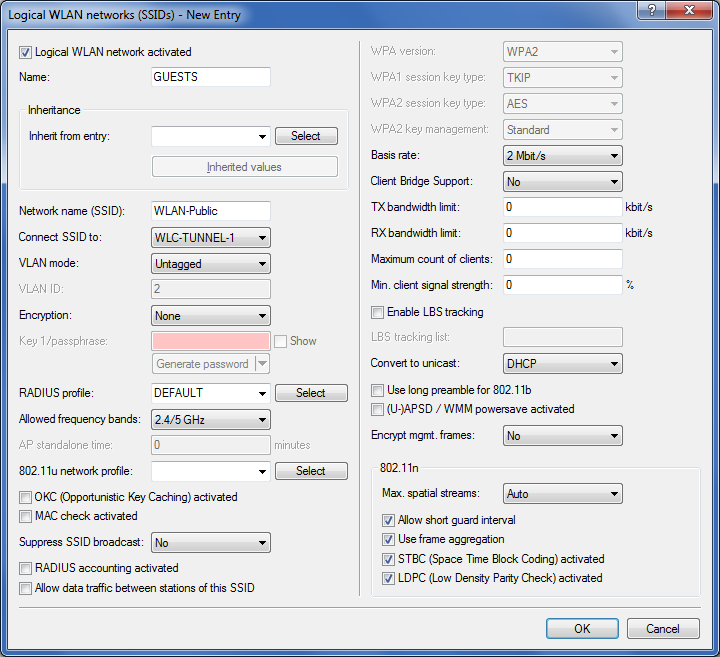 1. The internal WLAN and the guest WLAN each require an entry to be created in the list of logical networks, each with a suitable name and the corresponding SSID. Link the SSID for internal use with the 'LAN at AP', and the SSID for guests with (for example) 'WLC-TUNNEL-1'. Disable encryption for the guest network SSID so that the guests' WLAN clients can associate with the Public Spot. You should also prevent inter-station traffic for this SSID. In LANconfig you find this setting under Configuration > WLAN Controller > Profiles > Logical WLAN networks (SSIDs).