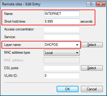 7. For the guest Internet access, create an entry in the list of DSL remote sites with the hold time '9999' and the pre-defined layer 'DHCPOE '. This example assumes that Internet access is provided by a router with DHCP server. In LANconfig you find this setting under Configuration > Communications > Remote sites > Remote sites.