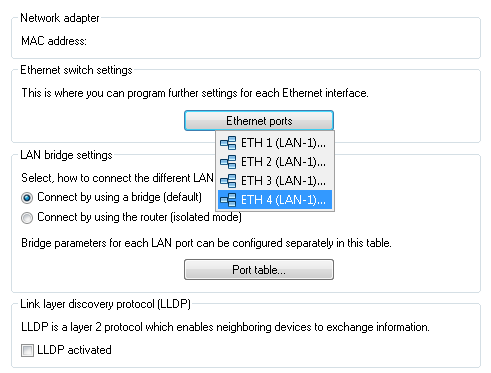5. Assign a separate logical LAN interface, e.g. 'LAN-1', to each physical Ethernet port. Set the 4th Ethernet port to the logical LAN interface 'DSL-1'. The WLC then uses this LAN interface for the guest network Internet access. In LANconfig you find this setting under Configuration > Interfaces > LAN > Ethernet ports.