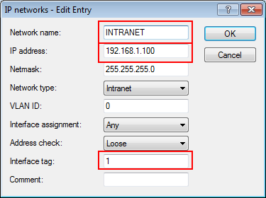8. For internal users, create the IP network 'INTRANET' with (for example) the IP address '192.168.1.100' and the interface tag '1'. For the guest access, create the IP network 'GUEST-ACCESS' with (for example) the IP address of '192.168.200.1' and the interface tag '2'. The virtual router in the WLC uses the interface tags to separate the routes for the two networks. In LANconfig you find this setting under Configuration > TCP/IP > General > IP networks.