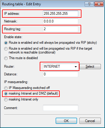 10. Create a new default route in the routing table to direct the data from the guest network to the Internet connection used by the WLC. Select the routing tag '2' and the router 'Internet'. Also activate the option 'Masking intranet and DMZ (default)'. In LANconfig you find this setting under Configuration > IP router > Routing > Routing table.