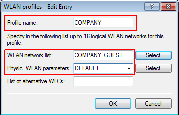 3. Create a WLAN profile and give it a suitable name. Then assign the logical WLAN networks and the physical WLAN parameters created previously to this WLAN profile. In LANconfig you find this setting under Configuration > WLAN Controller > Profiles > WLAN profiles.