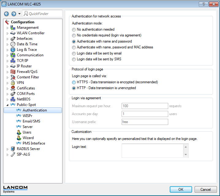 12. The final step is to enable authentication via the Public Spot for the WLC. In LANconfig you find this setting under Configuration > Public Spot > Authentication.