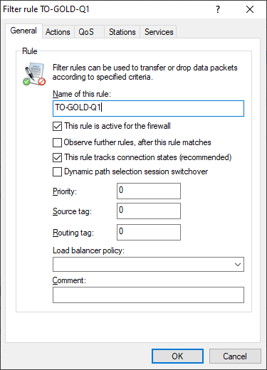 1. A queue assignment is implemented by a firewall rule, which is added under Firewall/QoS > IPv4 Rules > Firewall rules (Filter/QoS) > Rules. First, give a name to the rule on the General tab.