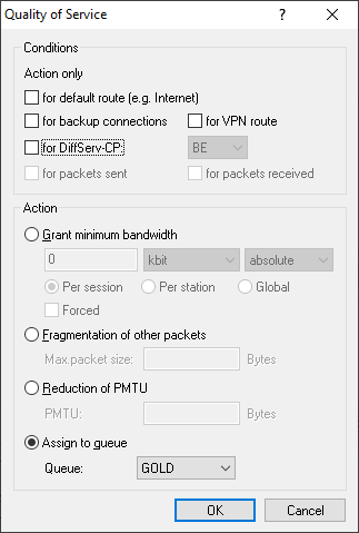 3. Next, add a new QoS object on the tab QoS. On the tab General give it a name and then assign it to the desired queue on the tab QoS. The action can be restricted with conditions, for example if the assignment should only apply in a certain direction or only for a certain DSCP value.