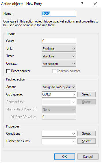 1. A queue is assigned via an action object assigned in an IPv6 forwarding rule. First, create an action object that assigns the desired queue. Do this under Firewall/QoS > IPv6 Rules > Firewall Objects > Action objects.