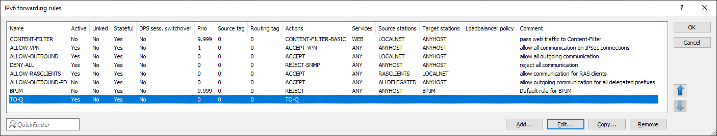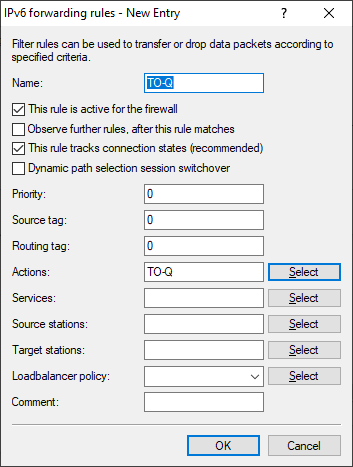 2. Under Firewall/QoS > IPv6 Rules > IPv6 forwarding rules you then create a new rule that uses this action object.