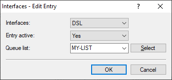 6. Finally, the configured list must be assigned to a WAN interface. In this example we take DSL. Switch to the dialog Firewall/QoS > QoS > Interfaces.