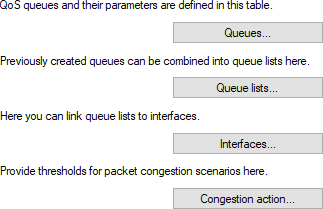 In the following explains the concept of how Quality of Service functions with eight queues. Routers should fundamentally be able to prioritize packets according to the DSCP value in the IP header. A total of eight queues are available for this purpose, which are strictly prioritized. This means that packets are sent starting with the queue with the highest priority and working through to the queue with the lowest priority. A packet is assigned to a queue based either on the DSCP value in the IP header or by a firewall rule. Of the eight available queues two are reserved, one for the Urgent-Queue (highest priority, for internal services such as VCM and protocol packets) and the other for the Best-Effort-Queue (lowest priority, for all non-priority packets). The remaining six queues are freely available to the user. The priority levels of the individual queues are set by placing them in a Queue-List in descending order of priority. The internal Urgent-Queue and Best-Effort-Queue are inserted at the front and end of this Queue-List. The completed queue list must then be assigned to a physical WAN interface. Following this, any packets sent to this WAN interface are prioritized according to the configuration of the queues.