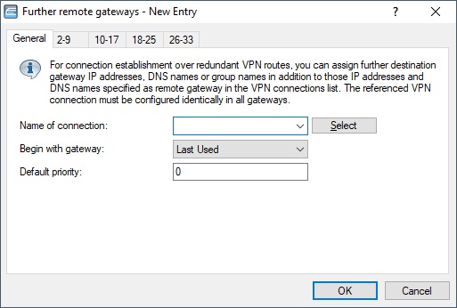The table Further remote gateways is used to specify redundant VPN routes by entering further destinations (as an IP address, DNS name or group name for the referenced connection) in addition to the IP address or DNS name specified as the remote gateway in the VPN connection list. All gateways have to be configured identically with respect to the referenced connection.