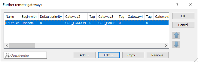 - Priority 0: A group is selected at random because in the table Further remote gateways, the column Begin with is set to "Random":
