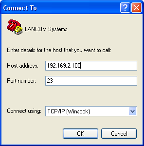 In the window 'Connect to' use the pulldown menu 'Connect using' and select the entry 'TCP/IP'. As 'Host address' enter the local/official IP address or the FQDN of the device. After confirmation, HyperTerminal dipslays a request to log in. Enter the configuration password.