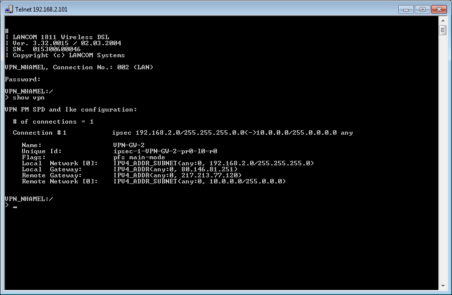 Information about the current VPN rules in the device can be retrieved with the Telnet terminal. Start a Telnet connection to the VPN gateway and enter the command show vpn in the terminal: