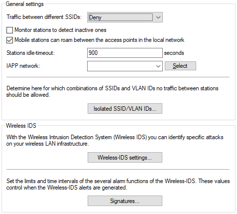 Important: Communications between clients in a logical WLAN is controlled separately by the logical WLAN settings (Inter-Station-Traffic). If the Inter-SSID-Traffic is activated and the Inter-Station-Traffic deactivated, a client in one logical WLAN can communicate with clients in another logical WLAN. This option can be prevented with the VLAN settings or protocol filter.