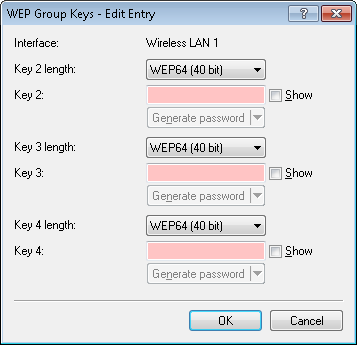 The WEP method uses keys of 40 (WEP64), 104 (WEP128) or 128 bits (WEP152) in length. Each WLAN interface has four WEP keys: A special key for each logical WLAN interface and three common group WEP keys for each physical WLAN interface.