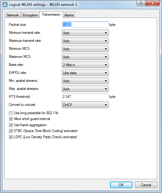 Details for the data transmission over the logical interface in LANconfig are set under Wireless LAN > General > Logical WLAN settings > Transmission.