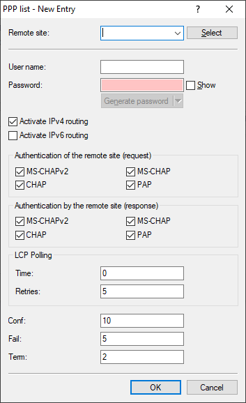 Enter the PPP password for this remote station. If your router has to log in to the remote station (e.g. an Internet provider), enter the log-in password here. If the remote station is to call your router, enter the log-in password with which the remote station will authenticate itself.