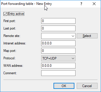 Note: If "0" is entered for the map port, the ports used in the LAN will be the same as those used in the WAN. If a port range is to be mapped, then the map port identifies the first LAN port to be used. For example, mapping the port range '1200' to '1205' to the internal map port '1000' means that the ports 1000 to 1005 will be used for data transfer in the LAN.Note: Port mapping is static, meaning that two ports or port ranges cannot be mapped to the same map port of a target computer in the LAN. The same port mapping can be used for different target computers.