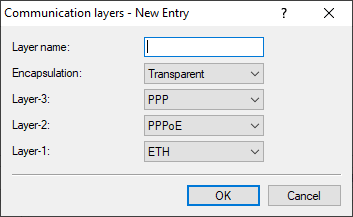 The communication layer list includes predefined common protocol combinations. Changes or additions should only be made if the remote sites are incompatible with the existing layers. The possible options are shown in the following overview.