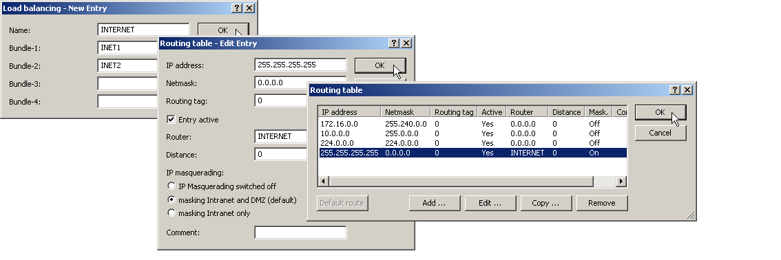 Note: The virtual remote site 'INTERNET' is now to be used for Internet access. When data are routed over this connection, the load balancing table will cause the "real" DSL connections to be established and the data will be transmitted over the selected DSL ports.