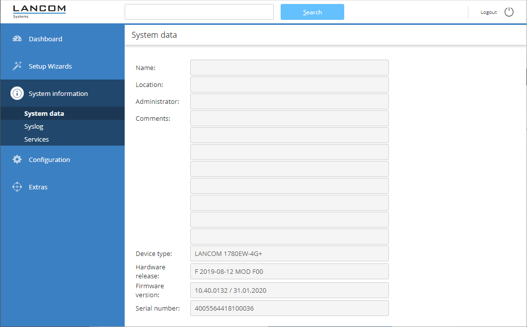 Under System information > System data you will find general information about the device, its location, firmware version, serial number, etc.