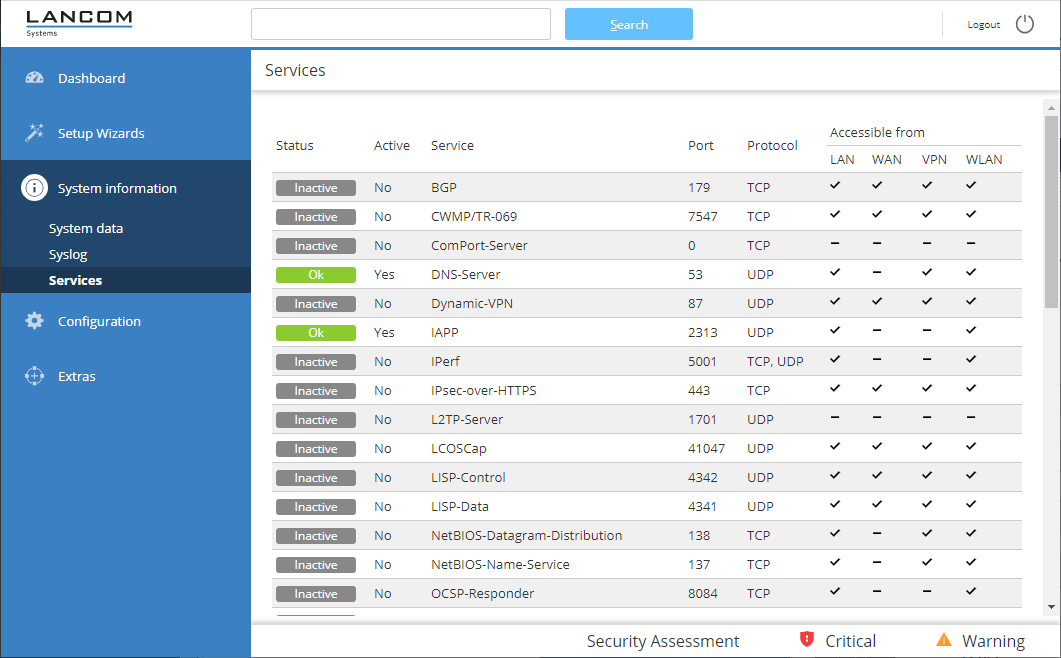 Here you have an overview of the internal LCOS services, their ports and protocols, whether they are active, and how they can be reached.