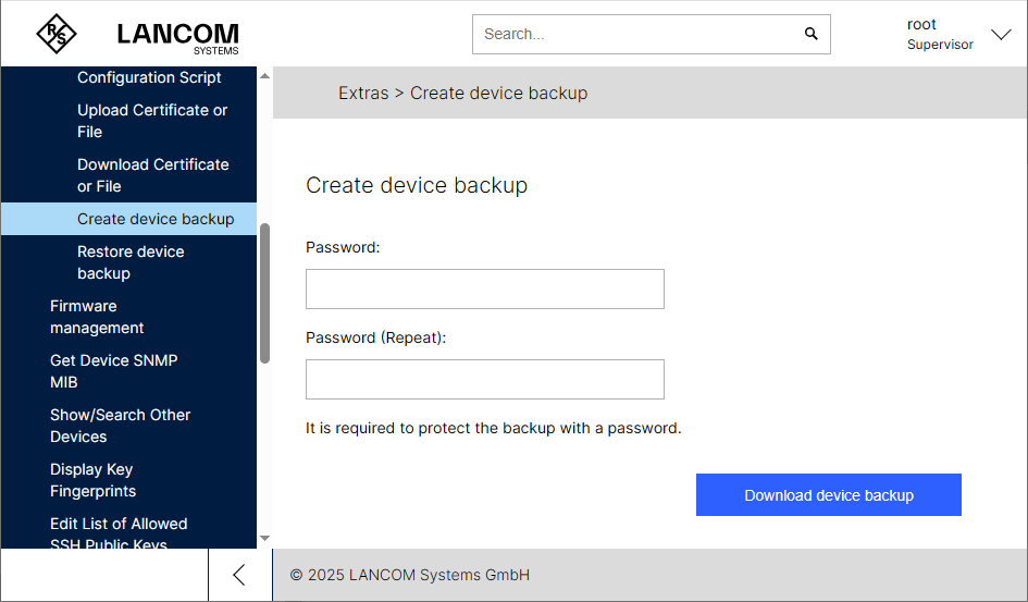 Under or , you can save important files in a password-protected ZIP archive. This file can later be uploaded back to the device for restoration.