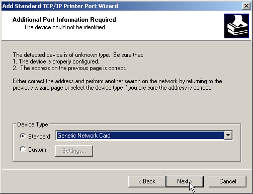- As the device type, select the option 'Standard' for a 'Generic Network Card'. If you wish to keep the standard settings (recommended), press on Next to proceed to the next dialog.