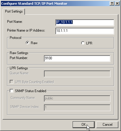 Note: The dialog for selecting the protocol and port can also be accesses via the Control Panel by opening the Printer Properties and