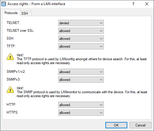 To open the LANconfig configuration dialogs containing the access rights from the local network (LAN), from the WLAN or via remote networks (WAN), go to in the section Device access and use the Access settings button. You then click on and select the appropriate interface: