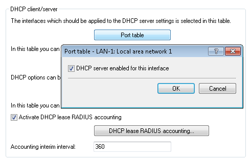 The DHCP server can be enabled or disabled separately for each logical interface (e.g. LAN-1, WLAN-1, P2P-1-1 etc.). To do this, select the appropriate logical interface from the configuration menu under IPv4 > DHCPv4 > Port table and switch the DHCP server on or off for this interface.