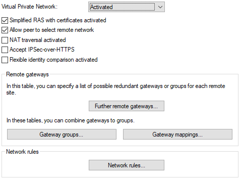 Important: If the system does not have "combined networks" (i.e.the branch office network is a sub-network of the switching node and the switching node network is a sub-network of the central network), then the switching node's route to the branch office must point to the main office in order for the branch office to be able to reach the switching node in backup situations. In normal operation, this route is overwritten by the route passed by the branch office in the VPN (because remote sites may provide network relationships) and is therefore only used when the direct connection is torn down and the branch office establishes the backup connection.